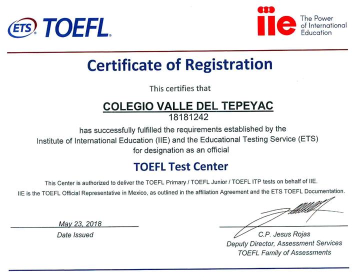 Desde el mes de mayo del 2018, el Colegio Valle del Tepeyac cumplio con éxito los requisitos establecidos por el Instituto de Educación Internacional (IIE) y el servicio de pruebas educativas (ETS), para finalmente ser designados como centro autorizado certificador de TOEFL.